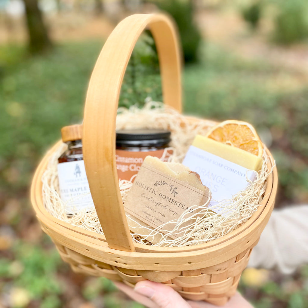 Our gift baskets are a curated collection of quality handcrafted items from small farms & businesses. We strive to support local and shop small as much as possible. Each item in the basket comes from our own store, or from another small business that fits within the guidelines of our purity standards. No dyes, no fragrance oils, no added chemicals.
