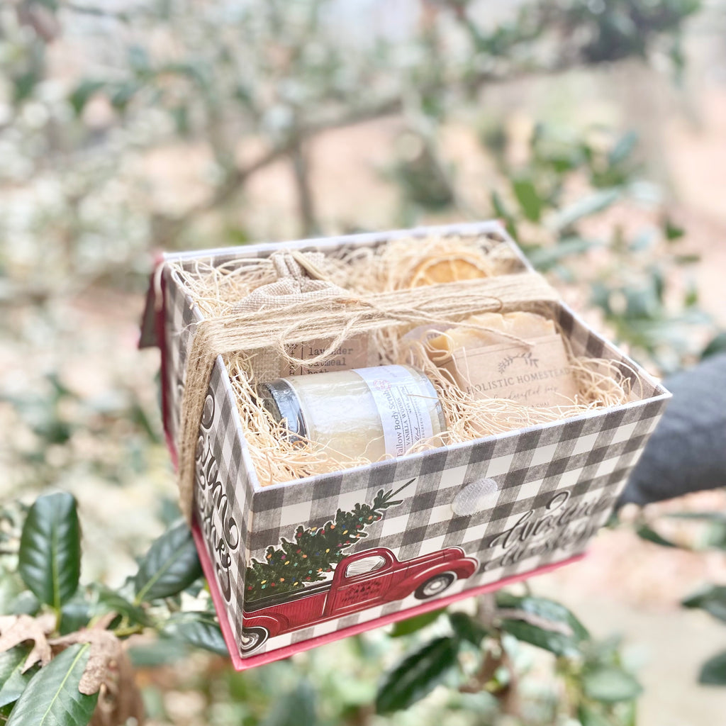 Our gift baskets are a curated collection of quality handcrafted items from small farms & businesses. We strive to support local and shop small as much as possible. Each item in the basket comes from our own store, or from another small business that fits within the guidelines of our purity standards. No dyes, no fragrance oils, no added chemicals.