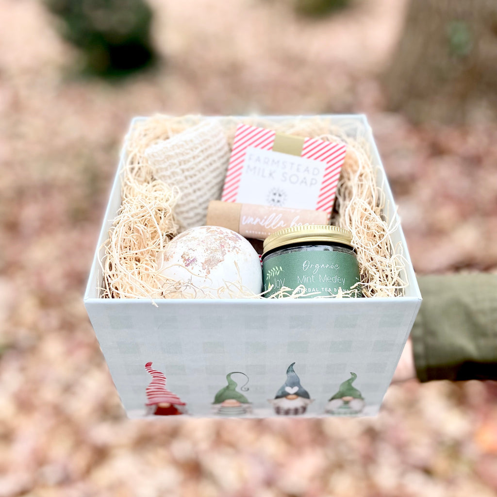 Our gift baskets are a curated collection of quality handcrafted items from small farms & businesses. We strive to support local and shop small as much as possible. Each item in the basket comes from our own store, or from another small business that fits within the guidelines of our purity standards. No dyes, no fragrance oils, no added chemicals.