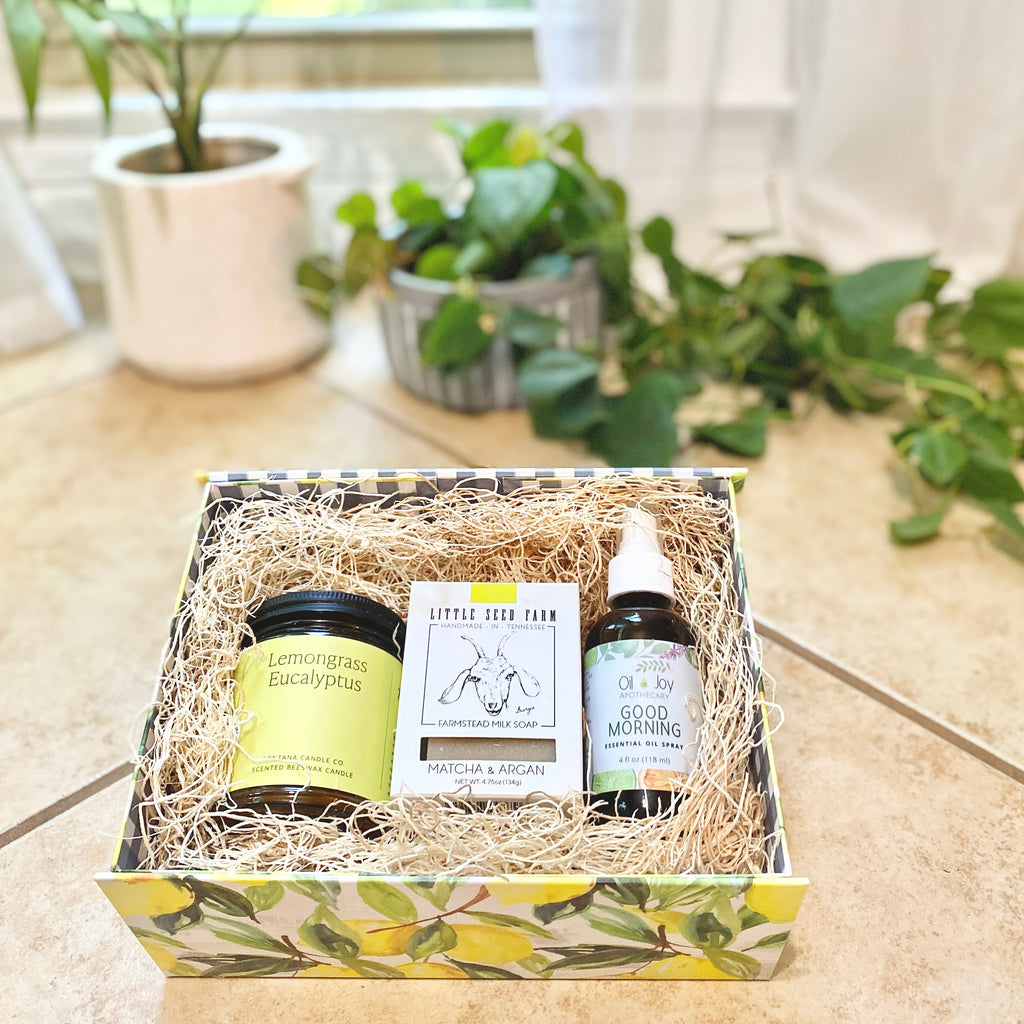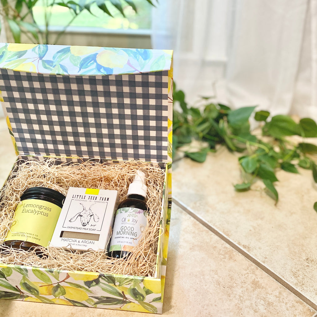 Our gift boxes are a curated collection of quality handcrafted items from small farms & businesses. We strive to support local and shop small as much as possible. Each item in the basket comes from our own store, or from another small business that fits within the guidelines of our purity standards. No dyes, no fragrance oils, no added chemicals.